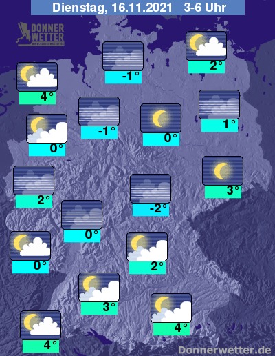 In der Nacht zum Dienstag ziehen über dem Süden des Landes noch meist viele und teils dichte Wolken durch. Im übrigen Bundesgebiet zeigt sich der Himmel verbreitet nur gering bewölkt oder sternenklar, dazu bleibt es trocken. Es bildet sich stellenweise Nebel, dabei besteht die Gefahr von Reifglätte! Die Temperatur sinkt auf 4 Grad im Breisgau und bis -2 Grad im Grabfeld.