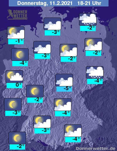 Heute Abend bleibt es über Thüringen und Sachsen noch meist bedeckt und hier fällt auch weiterhin gebietsweise Schnee, über der übrigen Osthälfte klingen letzte Flocken nach und nach ab und es sind auch Auflockerungen möglich. Weiter nach Westen hin ist der Himmel verbreitet locker bewölkt oder sternenklar, dazu bleibt es trocken. Die Temperatur liegt bei -5 Grad in Jena und bis 0 Grad in Köln.