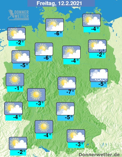 Am Freitag ist es verbreitet heiter bis sonnig, vor allem über dem Norden und Osten sind auch mehr Wolken möglich. Über Sachsen und im östlichen Brandenburg ist es oft stark bewölkt und hier ist etwas Schneefall möglich, sonst bleibt es trocken. Die Temperatur steigt auf -7 Grad im Thüringer Becken und bis -1 Grad im Rheinland.