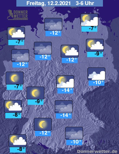 In der Nacht zum Freitag sind von Thüringen bis nach Sachsen unter oft dichten Wolken hier und da einige Flocken möglich. Stark bewölkt ist es auch im Ostseeumfeld, dabei können sich vereinzelt Schauer bilden. Im übrigen Bundesgebiet ist es verbreitet nur locker bewölkt oder sternenklar, dazu bleibt es trocken. Die Temperatur sinkt auf -7 Grad in der Kölner Bucht und bis etwa -14 Grad im Eichsfeld.