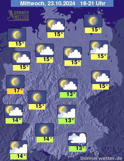 Heute Abend halten sich über Oberbayern dichte Wolken aus denen es zeitweise regnet. Im übrigen Bayern und im südlichen Baden-Württemberg ist es auch oft stark bewölkt, aber weitgehend trocken. Im großen Rest der Republik zeigt sich der Himmel dagegen locker bewölkt, zumeist sogar sternenklar, dazu bleibt es trocken. Die Temperatur liegt bei 13 Grad in München und etwa 17 Grad in Köln.