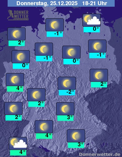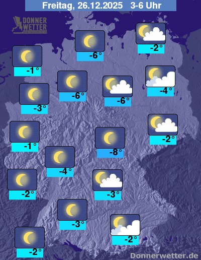 In der Nacht zum Freitag ziehen im Osten und Nordosten einige, meist noch aufgelockerte Wolken auf. Auch im Südosten können einige Wolken hereinziehen, teils bildet sich hier Nebel oder Hochnebel. Im übrigen Land bleibt es meist sternenklar. Es bleibt überall trocken bei Tiefstwerten von -1 Grad in Wilhelmshaven und -8 Grad in Jena.