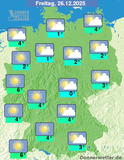 Am Freitag präsentiert sich das Wetter verbreitet heiter oder sonnig. Vor allem über der Nordosthälfte hält sich gebietsweise auch Nebel oder Hochnebel. Es bleibt landesweit trocken. Die Höchstwerte erreichen 0 Grad im Vogtland und bis 6 Grad am Oberrhein.