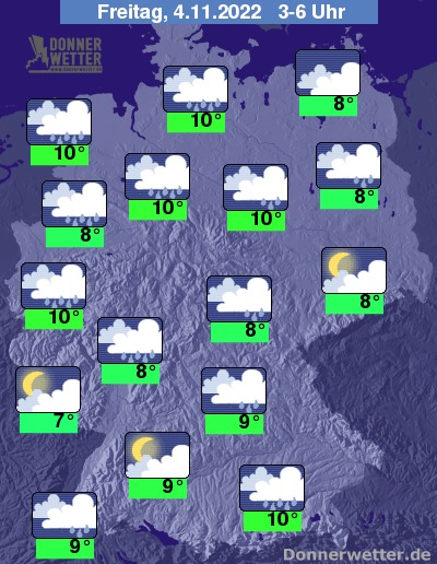 In der folgenden Nacht ziehen überwiegend dichte Wolken übers Land hinweg und es fällt vielerorts Regen bzw. es bilden sich einzelne Schauer. Auflockerungen sind eher selten bei Tiefstwerten von 10 Grad am Niederrhein und 7 Grad am Pfälzer Wald. Im Nordwesten und anfangs im Westen ist es noch oft stürmisch, an de Nordsee und in den nördlichen Mittelgebirgen herrscht häufig auch Sturm.
