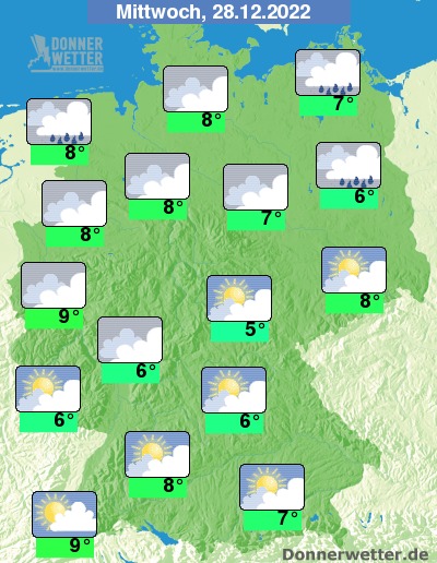 Am Mittwoch scheint im Süden hier und da die Sonne, im übrigen Land bleibt es bei verbreitet starker bis dichter Bewölkung. Im Norden fällt zudem gebietsweise Regen, während es sonst weitgehend trocken bleibt. Die Temperatur erreicht 5 Grad in Erfurt und bis 9 Grad in Köln. Im Norden und Westen ist es zum Teil stürmisch, an der Nordsee herrscht Sturm.