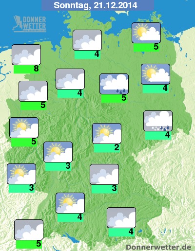 Am Sonntag wird es nur geringfügig freundlicher, denn es ziehen weiterhin meist viele, und oft auch dichte Wolken durch, gebietsweise kann sich aber auch mal die Sonne zeigen und es bleibt überwiegend trocken. Vor allem von der Mitte bis in den Osten des Landes fällt aber auch gebietsweise Regen oder Schneeregen. An den Küsten weht noch ein häufig starker Wind. Die Temperatur steigt auf 2 Grad im Grabfeld und bis 8 Grad im Emsland.