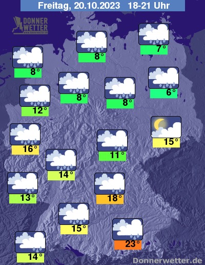 Heute Abend ziehen verbreitet kompakte Wolken übers Land hinweg und es fällt immer wieder, teils kräftiger und auch langanhaltender Regen. Die Temperatur liegt bei 6 Grad in Berlin und bis 23 Grad in München. Im Küstenumfeld weht ein oft stürmischer Wind, direkt an der See herrscht noch verbreitet Sturm.