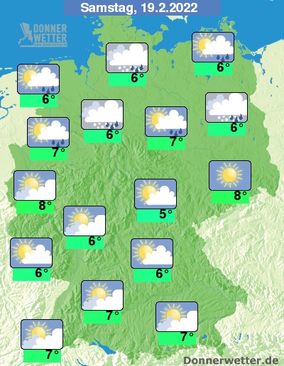 Am Samstag ist es vor allem im Süden und Osten oft heiter. Am Nachmittag ziehen im Norden und Westen zunehmend dichte Wolken auf, allerdings bleibt es hier noch weitgehend trocken, bevor am Abend Regen, Schneeregen oder Schnee einsetzen. Über der Nordosthälfte herrscht zum Teil Sturm, an den Küsten herrscht sogar oft schwerer Sturm. Die Temperatur steigt auf 5 Grad in Erfurt und bis 8 Grad in Köln.