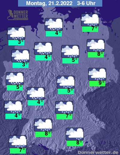 Am Montag bleibt es über der Bundesrepublik meist stark bewölkt oder bedeckt, hier und da zeigen sich mögliche Auflockerungen. Es fällt zeitweise Regen, zum Teil auch Schneeregen oder Schnee. Es weht ein verbreitet starker und teils stürmischer Wind, an der See herrscht Sturm. Die Temperatur steigt auf 6 Grad in Erfurt und bis 10 Grad in Bonn.