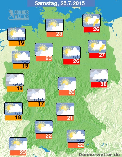 Am Samstag kann sich vor allem im Süden zwischen den Wolken häufig die Sonne zeigen, hier sind gebietsweise aber auch Schauer möglich, sonst ist es überwiegend stark oder wechselnd bewölkt und es bilden sich zum Teil kräftige Schauer und besonders in den Küstengebieten sowie im Osten des Landes auch einzelne Gewitter. Die Temperatur steigt auf kühle 17 Grad am Westerwald und bis auf schwülwarme 28 Grad in Dresden. Der Wind weht dabei zunehmend stark bis stürmisch, im Norden und Westen herrscht zum Teil sogar Sturm, dabei sind schwere Sturmböen möglich.