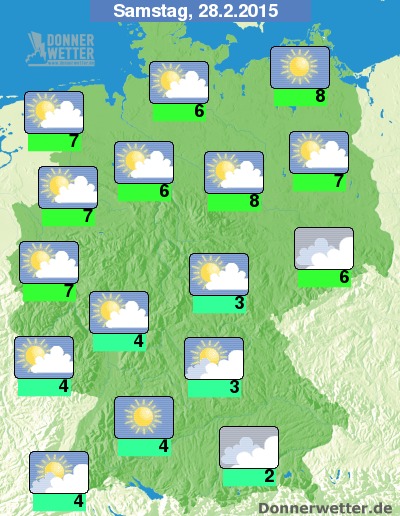 Der Sonntag wird insgesamt deutlich weniger freundlich, auch wenn es anfangs in der Osthälfte noch meist heiter und trocken ist. Von Westen her ziehen zunehmend dichte Wolken und nachfolgend Regen auf, der am Abend auch die östlichen Landesteile erreicht, dazu fällt nach Osten und Süden hin auch teils Schneeregen oder Schnee. Es werden 3 bis 8 Grad erreicht.