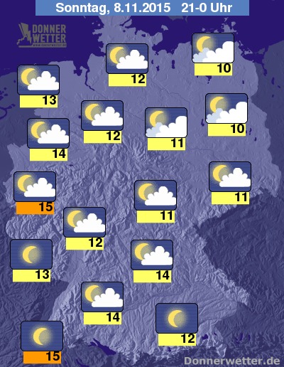 Der Sonntag Abend zeigt sich vor allem in der Nordwesthälfte bewölkt aber trocken. Im Süden kann es im weiteren Abendverlauf auch aufklaren. Die Temperaturen liegen am Abend noch immer bei Werten um 14 Grad C im Norden und um 20 Grad C im Schwarzwald.