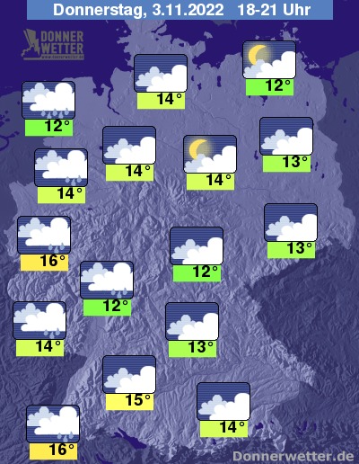 Heute Abend ist es über der Osthälfte Deutschlands noch teils aufgelockert, meist jedoch schon stark bewölkt, jedoch noch trocken. Weiter nach Westen hin ziehen bereits kompakte Wolken durch und es fällt verbreitet Regen. Die Temperatur liegt bei 12 Grad in Vorpommern und bis 16 Grad im Breisgau. Im Westen und Nordwesten weht ein zunehmend starker bis stürmischer Wind. Auf den Bergen und an der Nordsee herrscht häufig auch Sturm.