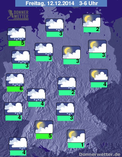 In der Nacht zum Freitag fällt im Süden und Südosten noch weiterer Regen, Schneeregen oder Schnee und es besteht weiterhin stellenweise Glättegefahr. Sonst ist es zunächst oft aufgelockert oder stark bewölkt bei nur einzelnen Schauern. Im Nachtverlauf ziehen aus Westen jedoch erneut dichte Wolken mit teils kräftigen Regenfällen auf. Gegen Morgen erreicht der Regen auch den Osten des Landes. Dazu weht verbreitet mäßiger bis frischer, im Norden und Westen auch starker und an den Küsten teils stürmischer Wind. Die Temperatur sinkt auf 6 Grad in Aachen und teils 0 Grad am Alpenrand.