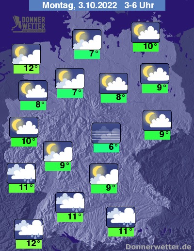 In der bevorstehenden Nacht fällt im Süden und Südwesten bei dichten Wolken weiterhin, teils länger anhaltender Regen. Weiter nach Norden und Osten hin zeigt sich der Himmel mehr und mehr aufgelockert oder locker bewölkt, dazu bleibt es trocken. Die Temperatur sinkt auf 12 Grad in Freiburg und 6 Grad in Erfurt.