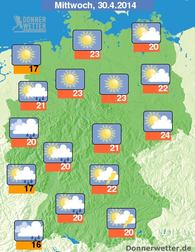 Trockenen Fußes kommt man am Vorfeiertag nach wie vor vor allem im Nordosten zur Maifeier, dabei ist es mit Temperaturen um 20 bis 24 Grad C fast sommerlich warm. Im Südwesten sind dagegen immer wieder Schauer und örtliche Gewitter zu erwarten; mit Werten um 17 bis 22 Grad bleibt es aber auch hier recht mild.