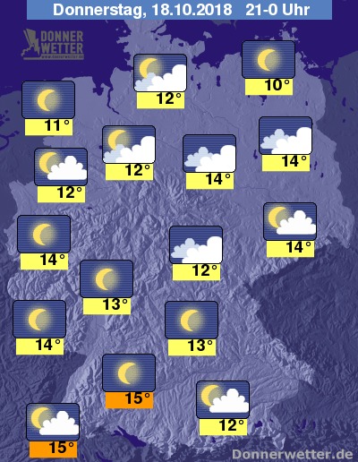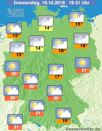 Am Abend halten sich in der Nordhälfte teilweise noch dichtere Wolken, Regen oder Sprühregen fällt jedoch kaum noch. Sonst kann man verbreitet den rötlich leuchtenden Sonnenuntergang genießen. Die Temperaturen bewegen sich vor Dämmerungsbeginn in der Mitte und im Süden oft noch bei angenehmen 17 bis 21 Grad, etwas kühler bleibt es im Norden. Hier liegen die Werte meist so zwischen 14 und 18 Grad.