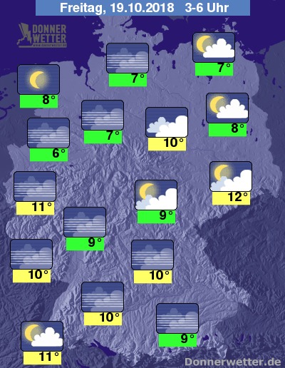 Während der zweiten Nachthälfte breiten sich häufiger Nebelgebiete aus oder verdichten sich, sonst bleibt es teils bewölkt, teils sternenklar. Bis zu den Frühstunden kühlt sich die Luft auf 6 bis 12 Grad ab. Außerhalb von Ortschaften kann es allerdings noch kälter werden.