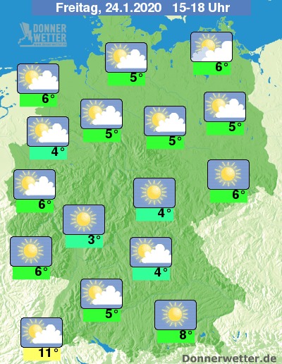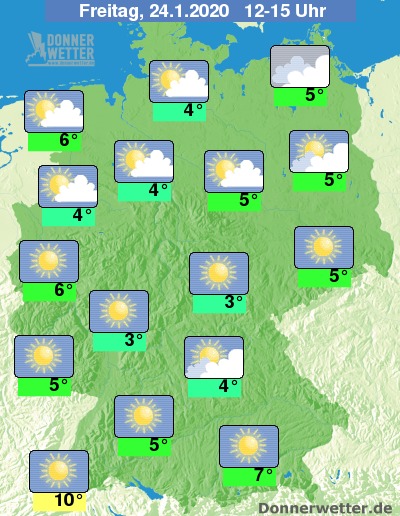 Am frühen Nachmittag hält sich gebietsweise Nebel oder Hochnebel, sonst scheint die Sonne. Im Norden gibt es eine Mischung aus Sonne und Wolken, diese können an der Ostsee auch mal dichter werden, Regen fällt aber nicht.