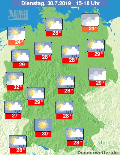 Die Temperaturen steigen im Laufe des Nachmittags noch etwas an und überschreiten im Westen häufig wieder die 30 Grad Marke.