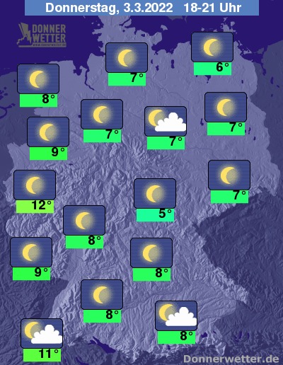 Heute Abend zeigt sich der Himmel größtenteils sternenklar, nur hier und da sind auch ein paar lockere Wolken möglich, dazu bleibt es trocken. Die Temperatur liegt anfangs noch bei 5 Grad in Erfurt und bis 12 Grad in Bonn.