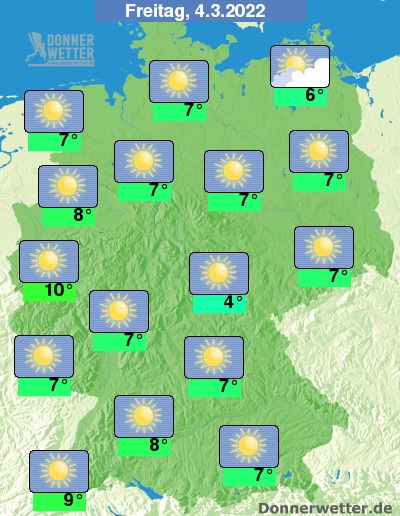 Am Freitag ist es überwiegend sonnig, hier und da können ein paar lockere Wolken durchziehen, dabei bleibt es trocken. Die Temperatur steigt auf teils nur 4 Grad im Grabfeld und bis 10 Grad in der Kölner Bucht.