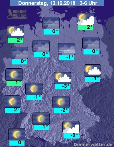 Die Luft kühlt bis zu den Frühstunden allgemein in den leichten Frostbereich ab. Lediglich an den Küsten und in den Ballungsgebieten des Westens bleibt es überwiegend frostfrei.