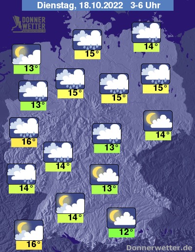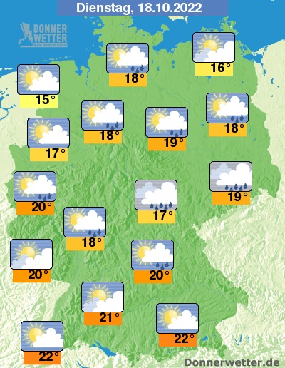 Am Dienstag ist es über dem Norden und Westen oft heiter, teils ziehen auch einige Wolken durch, jedoch bleibt es meist trocken. Im übrigen Bundesgebiet ziehen teilweise dichte Wolken durch, teils zeigen sich auch Aufheiterungen, dabei fällt gebietsweise Regen. Die Temperatur erreicht 15 Grad in Bremerhaven und bis 22 Grad in München.