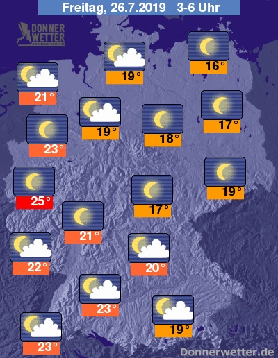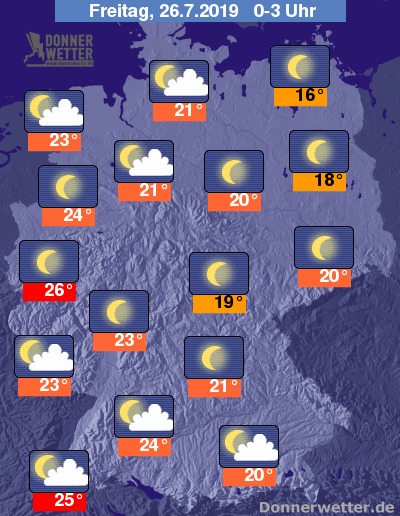 In der Nacht zeigt sich der Himmel über weiten Landesteilen sternenklar, an Weser und Elbe sowie im Süden ist es teils auch locker bewölkt. Es bleibt trocken. In Teilen des Westens und Südwestens ist erneut eine Tropennacht zu erwarten, hier sinken die Tiefstwerte regional nicht unter 25 Grad ab. Die tiefsten Temperaturen werden im äußersten Nordosten erreicht, hier stellenweise Werte um 16 Grad.