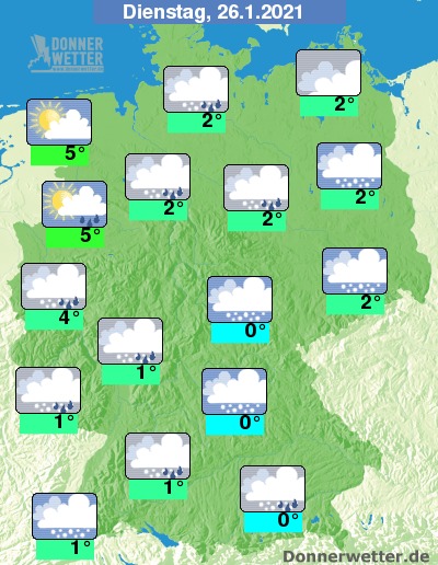 Heute fällt aus dichten Wolken zeit- und gebietsweise Schnee oder Schneeregen, zum Teil auch schauerartig verstärkt. Dabei muss vor allem oberhalb 200 bis 500 Metern mit rutschigen Straßen gerechnet werden. Im Nordwesten lässt sich zwischen einigen Regenwolken auch gelegentlich die Sonne blicken.