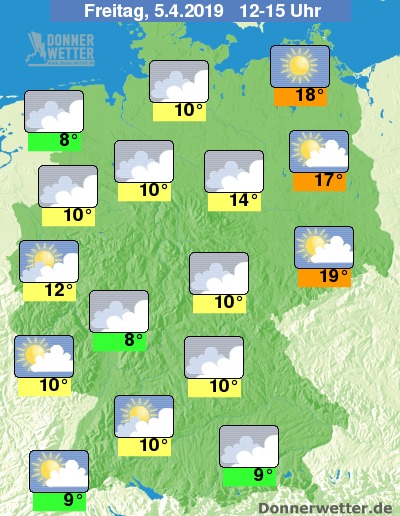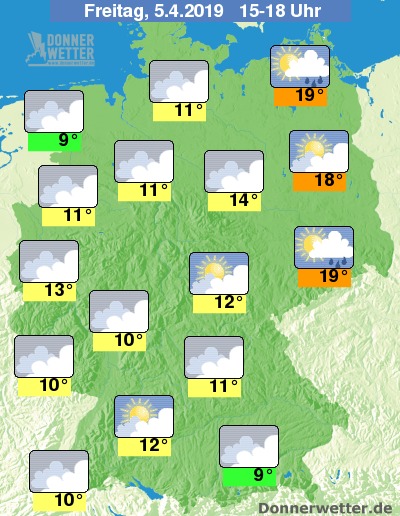 Im weiteren Verlauf des Nachmittags bröckelt die Wolkendecke auch in der Mitte stellenweise auf. Im Nordosten entwickeln sich in der recht warmen Frühlingsluft mächtigere Haufenwolken, die sich in Form örtlicher Regengüsse und einzelner Gewitter entladen können.