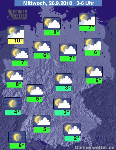 Die Temperaturen sinken in der Nacht auf Werte um 10 Grad C in Ostfriesland und um 2 Grad C entlang der Alpen.