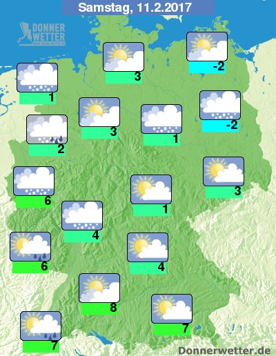 Am Samstag zeigt sich vor allem von Bayern über Thüringen bis nach Sachsen häufig die Sonne und hier bleibt es weitgehend trocken. In den anderen Landesteilen ziehen dagegen überwiegend dichte Wolken durch, dazu fällt besonders im Norden und Westen, jedoch auch über Berlin-Brandenburg und vom Schwarzwald bis zum Saarland gebietsweise Schnee, Schneeregen oder Regen. Vielerorts besteht Glättegefahr! Die Temperatur steigt auf -2 Grad an der Müritz und bis 8 Grad in Stuttgart.