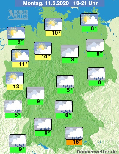 In den Abendstunden wechseln sich im Norden und Westen Sonne und wechselnde Bewölkung ab, Schauer sind dabei nur noch selten zu erwarten. Im Süden und Südosten bleibt die Wolkendecke weitgehend geschlossen und immer wieder fällt Regen, in höheren Lagen auch mit Schneeregen durchmischt.