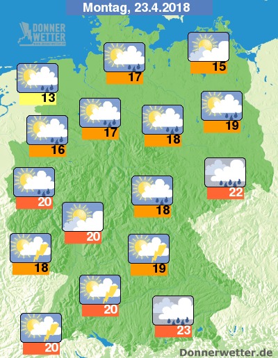 Heute gestaltet sich das Wetter im Land verbreitet stark oder aufgelockert bewölkt, dabei bilden sich wiederholt Schauer, über der Südhälfte sind auch vielerorts Gewitter möglich. Die Temperatur steigt nur noch auf 13 Grad in Cuxhaven und bis 23 Grad in München.