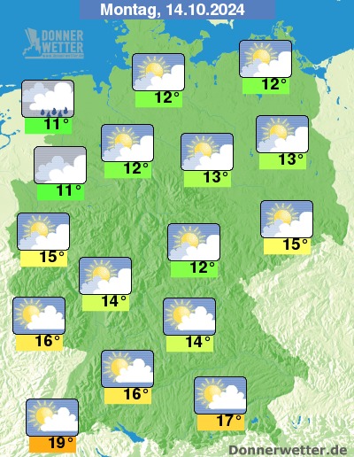 Am Montag zeigt sich der Himmel nach Nebelauflösung verbreitet heiter bis wolkig und es bleibt zunächst trocken. Dichter bewölkt ist es im Nordwesten, hier fällt auch zeitweise etwas Regen. Auch im Süden und der Mitte verdichten sich die Wolken im Tagesverlauf und es muss mit einzelnen Niederschlägen gerechnet werden.