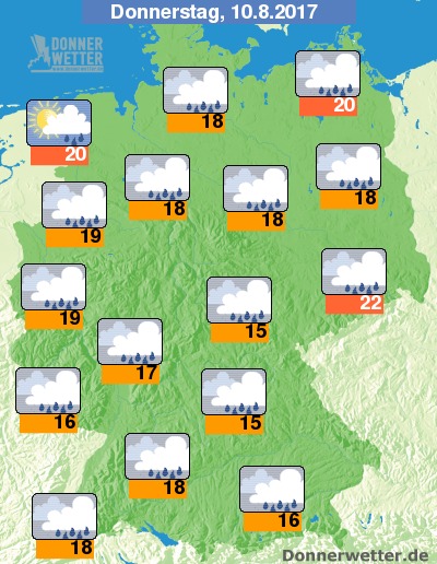 Am Donnerstag hält sich überwiegend dichte, nur hier und da auch mal etwas aufgelockerte Bewölkung, dabei fällt immer wieder, teils auch kräftiger und gewittriger Regen. Die Temperatur steigt auf 15 Grad im Thüringer Becken und bis 22 Grad in der Lausitz.