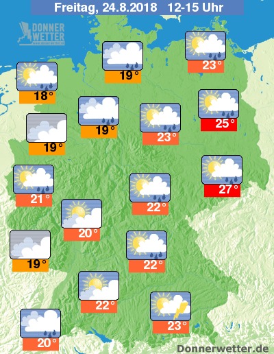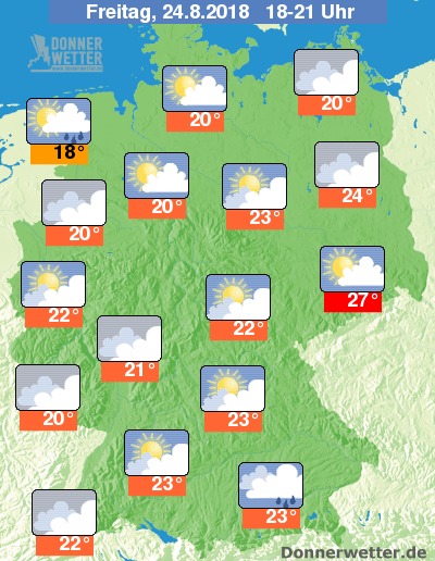 Dabei sind die Temperaturen um bis zu 10 Grad gegenüber dem Vortag gefallen. Verbreitet werden nur noch Höchstwerte knapp über der 20 Grad Marke erreicht, an der Nordsee bleibt es mit maximal 18 Grad sogar noch etwas kühler. Nach wie vor warm ist es im Osten, Dresden erreicht noch einmal bis zu 27 Grad.