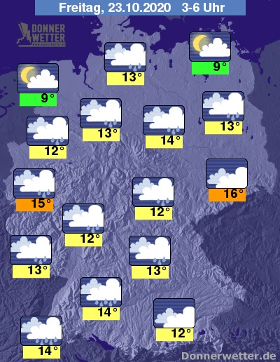 In der Nacht zum Freitag zieht ein Tiefausläufer mit Regen über das Bundesgebiet hinweg. Ab der zweiten Nachthälfte klingen die Niederschläge im Norden und Nordwesten ab und es lockert hier meist auf. Die Temperatur sinkt auf 16 Grad in Dresden und bis 9 Grad an den Küsten.
