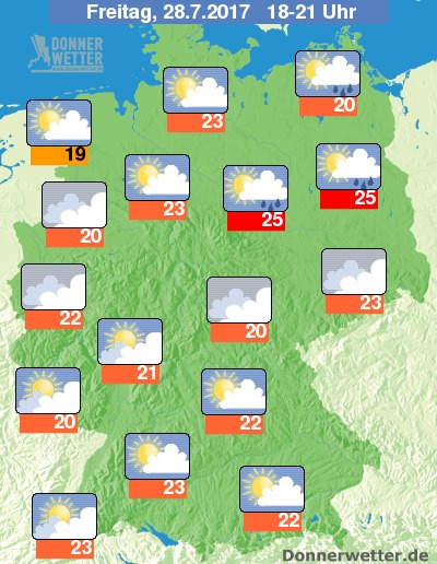 Heute Abend ziehen über den Osten und Nordosten des Landes häufig dichte Wolken hinweg, dabei bilden sich lokal Schauer. Über der übrigen Nordhälfte Deutschlands ist es teils wechselnd, teils aber auch stark bewölkt, jedoch weitgehend trocken. Weiter nach Süden hin zeigt sich das Wetter zum Großteil heiter bis sonnig und dabei auch trocken. Die Temperatur liegt bei 19 Grad in Bremerhaven und bis 25 Grad in Berlin.
