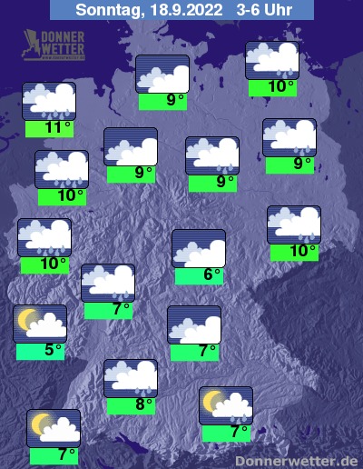 In der Nacht zum Sonntag ist es vor allem im Süden zeitweise aufgelockert bewölkt, ansonsten ziehen von Nordwesten her jedoch überwiegend dichte Wolken durch und es bilden sich vielerorts Schauer. Die Temperatur sinkt auf 11 Grad in Cuxhaven und bis 6 Grad in Jena. An der Nordsee weht ein oft stürmischer Wind.