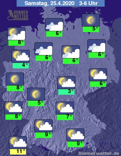 Nach Mitternacht zeigt sich der Himmel zunächst noch verbreitet locker bewölkt. In den frühen Morgenstunden nimmt die Bewölkung über dem norddeutschen Tiefland zu, weiter südlich dominieren weiterhin lockere Wolken, teils ist es auch sternenklar. Es bleibt trocken.