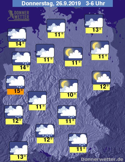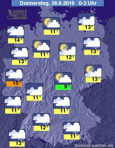 In der Nacht ist der Himmel über weiten Landesteilen dicht bewölkt oder bedeckt und vor allem im Süden und Westen fallen immer wieder Schauer, die zeitweise auch kräftiger ausfallen können. In der Osthälfte überwiegt in der Nacht lockere oder aufgelockerte Bewölkung und es bleibt meist trocken.