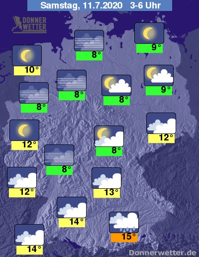 Bis zu den Frühstunden kühlt die Luft im Norden und in der Mitte häufig auf einstellige Werte ab. Im Süden sowie in Teilen von Sachsen bleibt es mit 15 bis 12 Grad noch recht mild.