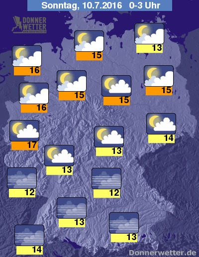 Die Temperaturen sinken im Nachtverlauf auf Tiefstwerte um 16 Grad C am Mittelrhein und um 11 Grad C im Saarland.