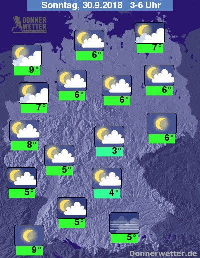 In der Nacht zum Sonntag ist der Himmel über dem Süden und über Sachsen meist sternenklar, im übrigen Bundesgebiet ist es weitgehend locker bewölkt. Im Umfeld der Küsten ist es hingegen meist stark oder noch aufgelockert bewölkt, dazu bleibt es trocken. Die Temperatur sinkt auf 9 Grad in Emden und bis 3 Grad im Vogtland.