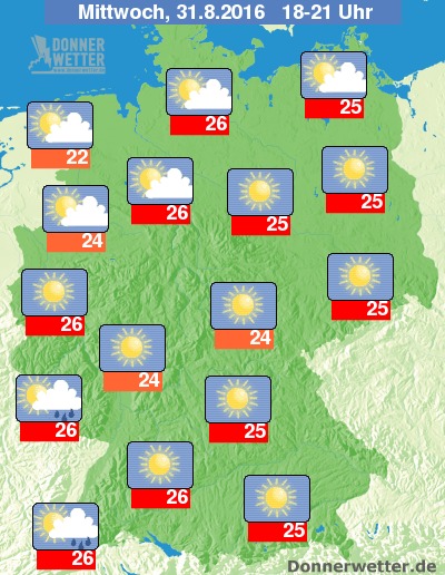August stockt sein Sonnenscheinkonto bis zuletzt auf, Temperaturen um 22 bis 26 Grad C am Abend.