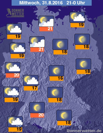In der ersten Nachthälfte nimmt die Bewölkung in der Westhälfte zu, einzelne Schauer beschränken sich dabei auf das Gebiet zwischen Oberrhein und Hunsrück. Ein sternenklarer Himmel zeigt sich im Süden und Osten der Republik.