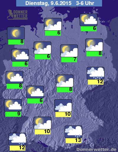 Die Tiefstwerte liegen in der Nacht bei Temperaturen um 12 Grad C im Breisgau und um 6 Grad C entlang der Küsten.