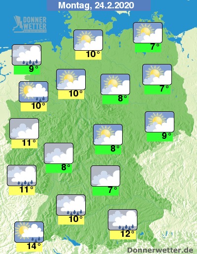 Am Rosenmontag ist es teils stark, teils auch aufgelockert bewölkt, dabei fällt im Norden und Süden vorübergehend gebietsweise Regen, sonst bleibt es aber weitgehend trocken. Die Temperatur steigt auf rund 7 Grad an der Oder und bis 14 Grad im Oberrheingraben. An der Nordsee weht ein zum Teil stürmischer Wind.